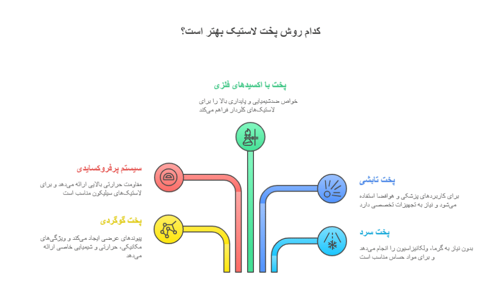 | پخت تابشی | اشعه گاما یا الکترونی | محیطی یا سرد | چند ثانیه تا دقیقه | محصولات پزشکی، حساس به دما | پخت سریع، بدون گرما، مناسب برای مواد ظریف | هزینه بالا، نیاز به تجهیزات پیشرفته | NR، PE، PVC، EPDM |